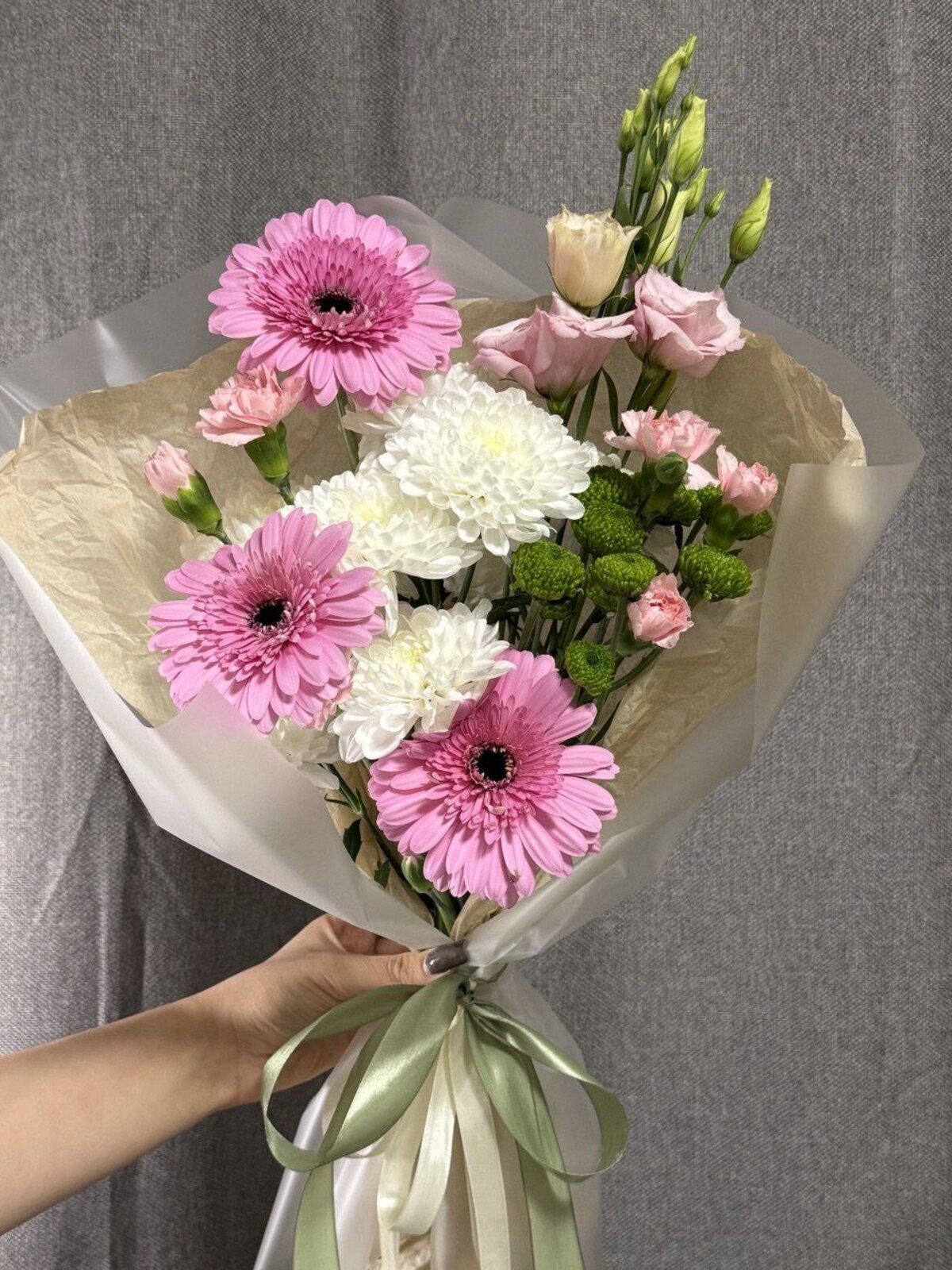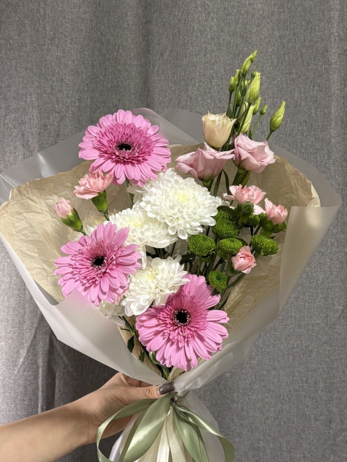 Подарите близким красоту природы в виде великолепного букета! Эти цветы — воплощение элегантности и изысканности. Хризантемы символизируют тепло и уют, Эустомы пленят нежностью своих лепестков, Кустовые Гвоздики говорят о стойкости чувств, Герберы дарят радость момента, а хризантемы Делигрин подчеркивают безупречный вкус.