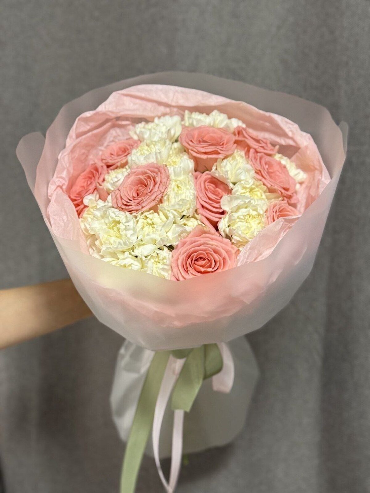Элегантное сочетание нежных розовых оттенков розы и романтичных акцентов диантуса создадут незабываемое впечатление! Идеальный букет для тех, кто ценит утонченность природы и гармонию композиций.